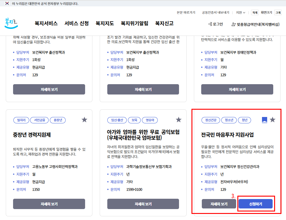 - 온라인 신청: 복지로(www.bokjiro.go.kr)에서 공인인증서를 이용하여 본인 인증 후, 증빙서류를 첨부하여 신청합니다. 신청 후 바우처 발급까지는 평균 10일 이내로 소요되며, 주민등록 주소지를 기준으로 신청자에게 가장 가까운 상담소 목록이 함께 안내됩니다.